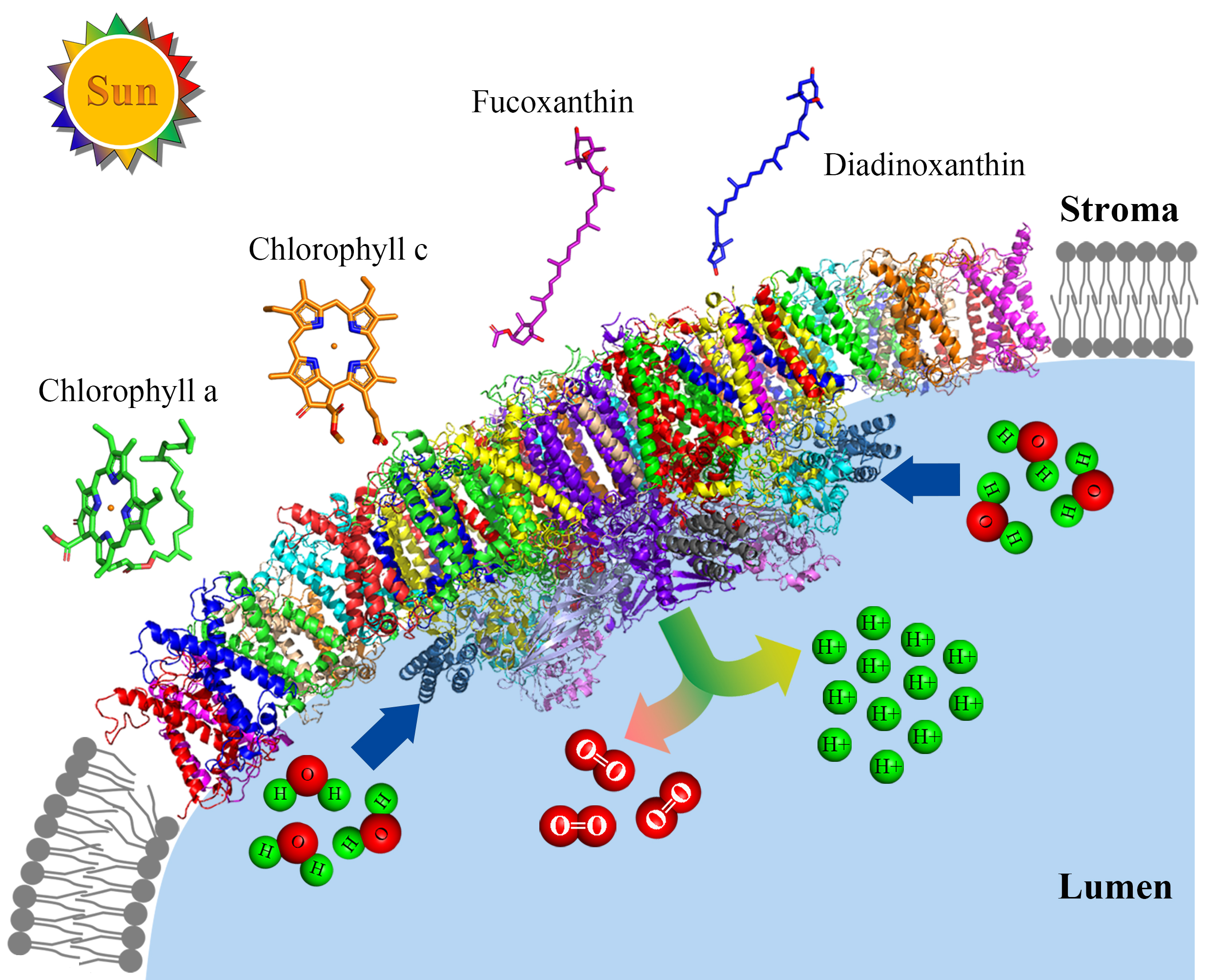 植物や藻類が行う光合成反応は、光エネルギーを利用して二酸化炭素と水を有機物に変換し、酸素を放出するもので、地球上ほぼすべての生物の生存を支えています。我々は、X線結晶構造解析やX線自由電子レーザー (XFEL)を用いた時間分解構造解析、さらにクライオ電子顕微鏡を用いた構造解析技術を駆使して、この反応に関わっている、光エネルギーを化学エネルギーへ変換するタンパク質複合体の構造と機能を解析しています。これまで光化学系II (PSII)の構造を原子分解能で解析し、水分解反応の中間体の構造を解析することで、水分解・酸素発生反応の機構をほぼ解明し、人工光合成にも重要な基盤を提供しました。また、様々な光合成生物から光化学系II 、光化学系I (PSI)と光捕集アンテナタンパク質の超分子複合体の構造を解析し、これら複合体における光エネルギー伝達のメカニズムを解明しただけでなく、進化における複合体の変化を明らかにしてきました。